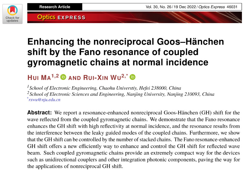 近日,巢湖學(xué)院電子工程學(xué)院馬慧博士在實(shí)現(xiàn)非互易Goos–H?nchen位移的研究中取得新進(jìn)展,其相關(guān)成果以“Enhancing nonreciprocal Goos–H?nchen shift by Fano resonance of coupled gyromagnetic chains at normalincidence”為題發(fā)表在國(guó)際知名光學(xué)期刊《OpticsExpress》。