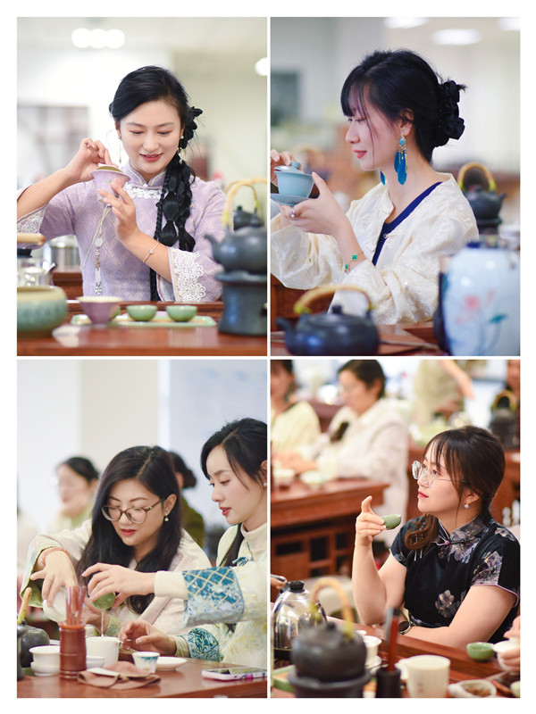 在互動體驗環節中,在唐麗麗老師的指導下,女教職工體驗了“備具、布具、沖泡、奉茶”的完整流程,從水溫控制到注水方式,細致打磨每一個環節,在奉茶、品鑒的過程中,體悟“以茶會友、以禮相待”的東方待客之道。隨后的“旗袍秀”環節成為活動亮點,女教職工身著旗袍自信走秀、拍照,舉手投足間將旗袍的柔美與茶文化的端莊完美融合。活動尾聲,大家圍坐品茗,交流體驗心得,分享對茶文化與旗袍文化的理解。