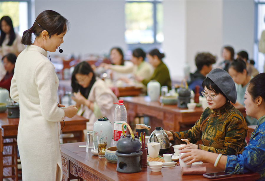 現場布置古雅,木質茶桌、青花瓷具搭配古典樂曲,營造出“茶韻待綻、旗影翩躚”的雅致氛圍。活動特別邀請旅游管理學院唐麗麗老師到現場傳授茶藝知識。她從茶葉分類、窨制工藝與品茶禮儀等方面進行專業講解并作茶藝演示,提壺、注水、溫杯、分茶,一系列動作行云流水、優雅從容,裊裊茶香中,女教職工深入了解了中國茶文化的歷史傳承與精神內涵,感受到“一盅清茶含古今”的東方智慧。?