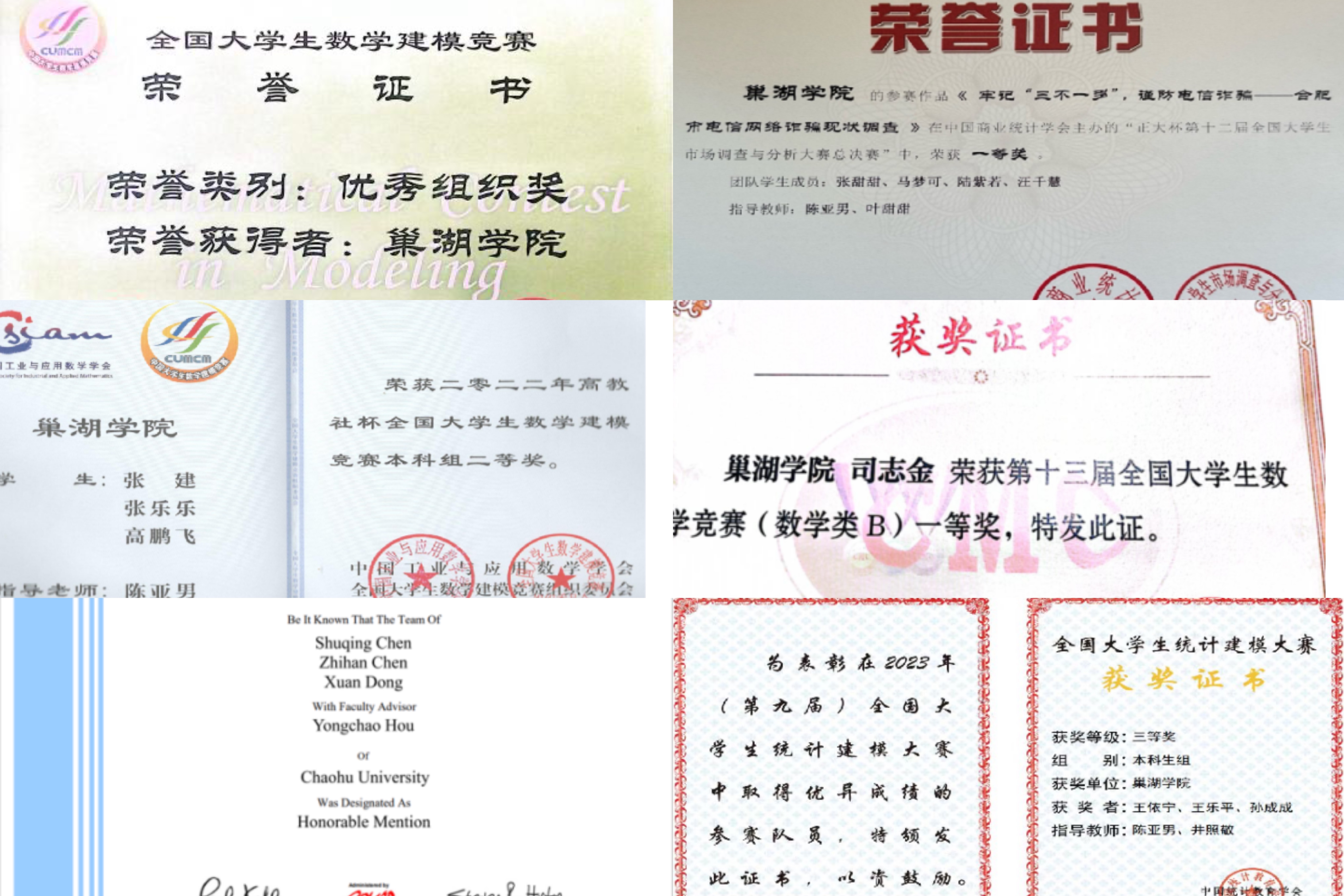 學院鼓勵引導學生參加各類學科競賽,堅持“賽”“會”一體,依托全國大學生市場調查與分析大賽、統計建模大賽、數學建模大賽等頂級大賽,精心打造數學建模協會、市場調查與分析協會等2個協會,選拔骨干教師擔任社團指導教師,堅持以賽促學、以賽促練、以賽強基、以賽提能。2024年9月數學建模協會獲評五星級社團(第一名)。學生獲獎人數、獲獎級別屢創新高。學生四年內生均參加各類比賽2.43次。2022年在“高教社”杯全國大學生數學建模競賽獲全國二等獎1項,安徽省二等獎3項、三等獎8項。2023年數學建模團隊獲得安徽省賽區一等獎2項、二等獎4項、三等獎10項的優異成績,并獲得安徽賽區優秀組織獎,另有2位老師獲得省級優秀指導教師。2024年學生在美國大學生數學建模競賽中獲得國際一等獎1項、二等獎2項。近幾年學生獲得全國市場調查大賽國家級一等獎1項、二等獎和三等獎多項,位居省屬高校前列。2023年學生榮獲統計建模比賽國家三等獎1項。學院重視科研育人,近三年以來學生發表學術論文12篇,其中 SCI/SSCI等一類論文4 篇。堅持服務地方,充分發揮應用統計學、大數據管理與應用學科專業優勢,與科大訊飛等多家企業開展深度校企合作。學院多次獲得就業創業先進集體,其中考研等高質量就業率約為學校平均水平的2倍。