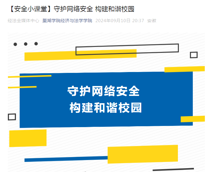 為擴(kuò)大宣傳覆蓋面,學(xué)院充分利用易班工作站,在“兩微一端”等新媒體傳播平臺(tái),發(fā)布題為:【安全小課堂】守護(hù)網(wǎng)絡(luò)安全 構(gòu)建和諧校園的推文。推文從什么是網(wǎng)絡(luò)安全、網(wǎng)絡(luò)安全相關(guān)法律、網(wǎng)絡(luò)陷阱知多少和網(wǎng)絡(luò)安全技能等方面普及網(wǎng)絡(luò)安全知識(shí),引導(dǎo)師生關(guān)注網(wǎng)絡(luò)安全,積極參與網(wǎng)絡(luò)安全建設(shè),協(xié)力營(yíng)造清朗網(wǎng)絡(luò)環(huán)境,共同維護(hù)網(wǎng)絡(luò)空間的安全和穩(wěn)定。