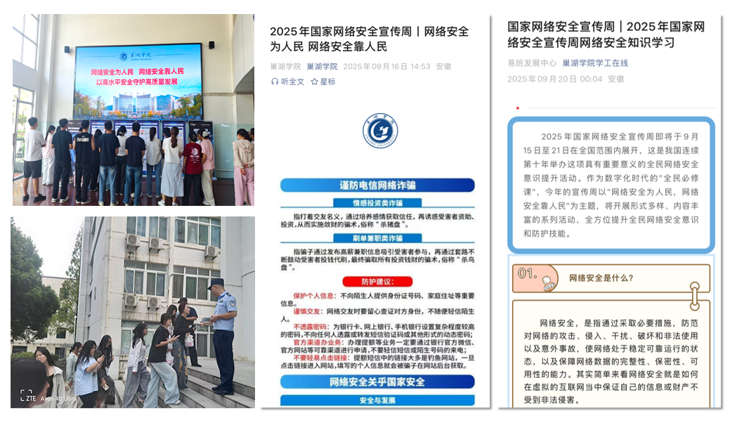 2025年國家網(wǎng)絡(luò)安全宣傳周于9月15日至21日在全國范圍內(nèi)舉辦。巢湖學(xué)院積極響應(yīng)號召,緊扣“網(wǎng)絡(luò)安全為人民,網(wǎng)絡(luò)安全靠人民——以高水平安全守護(hù)高質(zhì)量發(fā)展”主題,開展形式多樣、內(nèi)容豐富的宣傳教育活動,全力普及網(wǎng)絡(luò)安全知識,提升師生網(wǎng)絡(luò)安全素養(yǎng),致力于營造清朗的校園網(wǎng)絡(luò)空間。