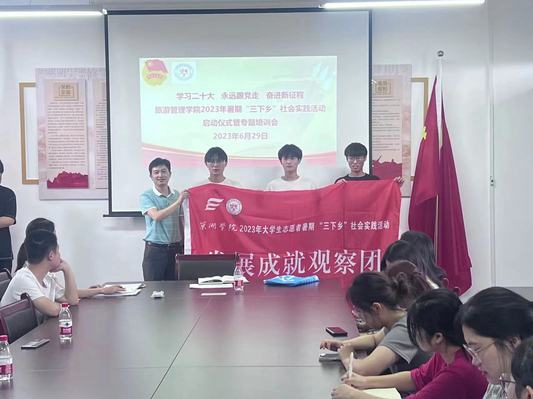 6月29日,旅游管理學院召開2023年暑期“三下鄉”社會實踐活動啟動儀式暨工作培訓會。旅游學院黨委副書記鄧其志出席活動并為4支院級團隊授旗。部分指導教師、社會實踐團隊參加會議,會議由學院團委副書記馬其霞主持。