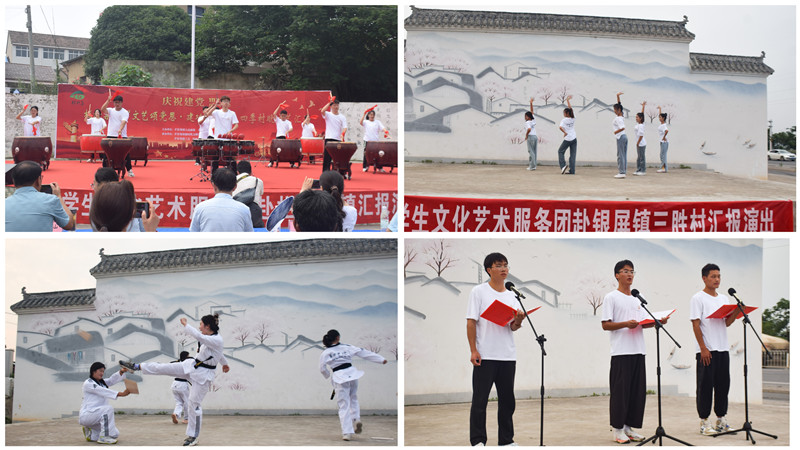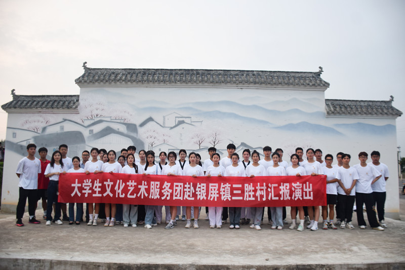 在建黨102周年華誕,巢湖學院“一院一鎮一品”專項團——大學生文化藝術服務團走進巢湖市欄桿集鎮、銀屏鎮三勝村,圍繞“學習二十大 永遠跟黨走奮進新征程”主題開展體育文藝巡回演出。服務團由來自體育學院和工商管理學院共50名大學生組成,巢湖學院體育學院黨委副書記朱春花、服務團指導老師郭世洪和杜銳率隊參加活動。