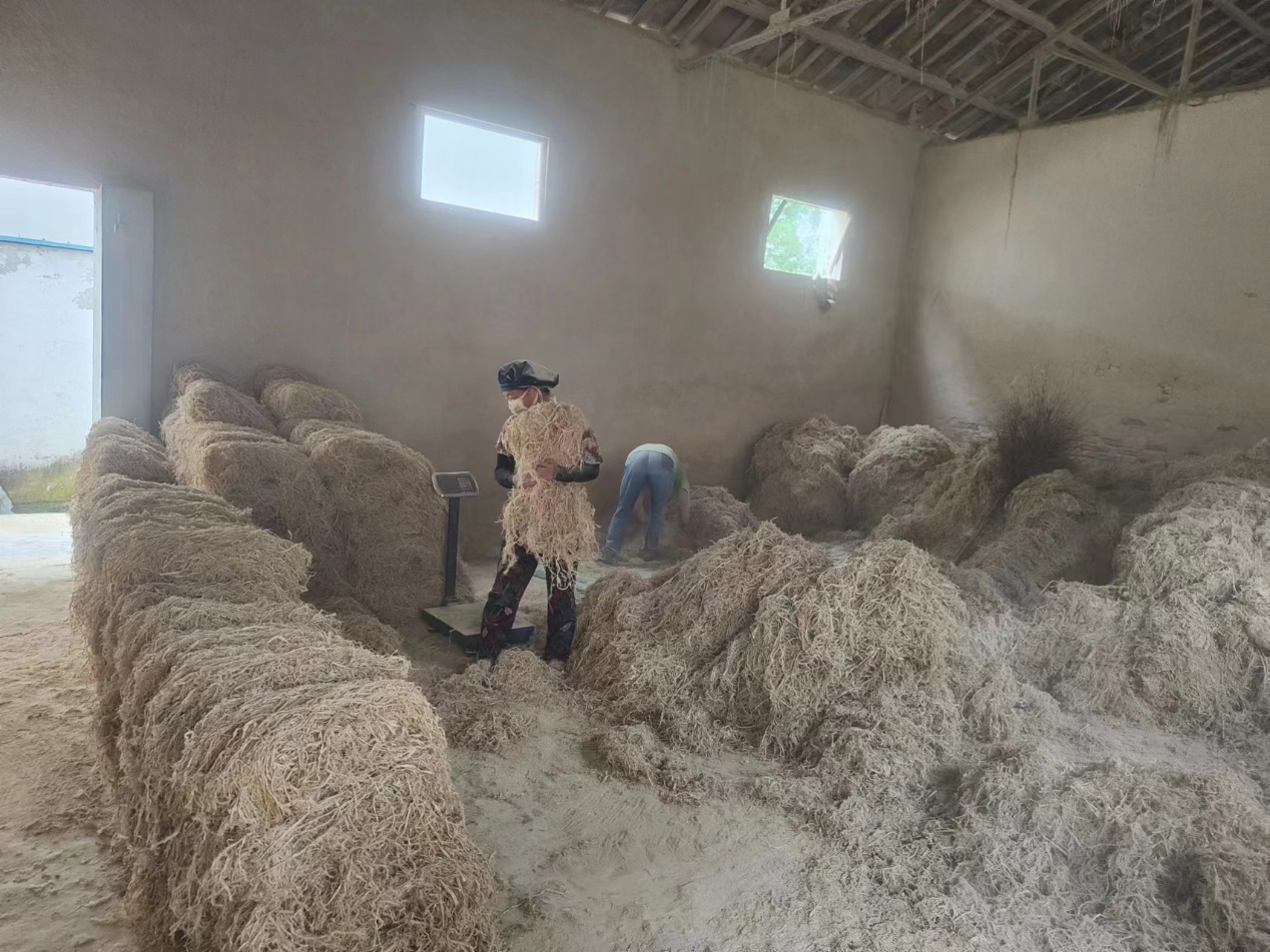 隨后,志愿者跟隨烏溪村村民的指示,走進山下一排平房內,看到工人師傅們正在處理剛從山上運下來的稻草。志愿者們經過詢問發現,這里的工人師傅都是來自烏溪村的村民,由于離家近的原因,很多的村民會選擇來這里工作。