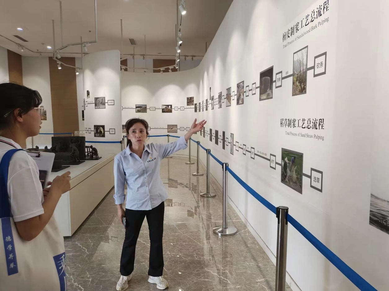 除此之外,園區內工作人員也熱情的為志愿者們講述起宣紙原材料挑選以及加工方式。志愿者們了解到宣紙的制作是由精選的沙田稻草和喬木青檀皮制成。在工作人員的指引下,志愿者們來到了館藏宣紙與書畫精品展示區,各式各樣的書法及繪畫作品被陳列于此。