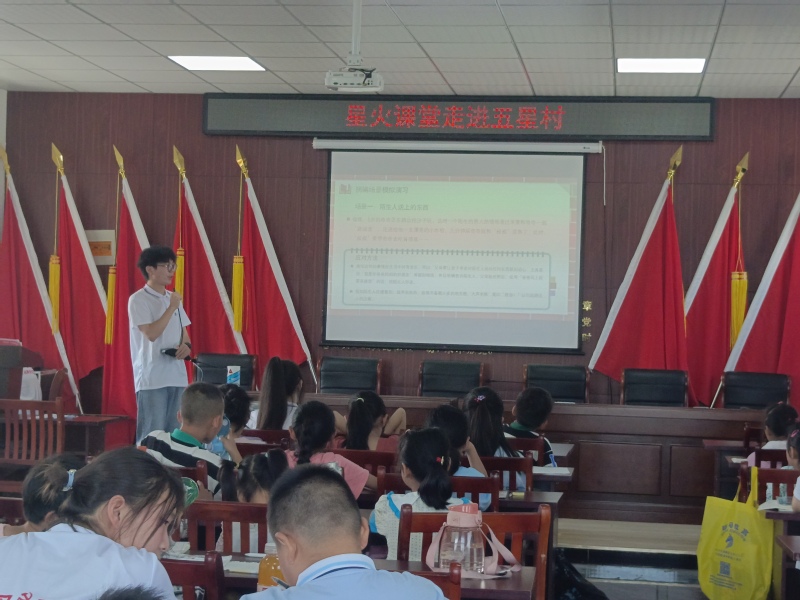 入戶宣傳是一種強化認識的手段,然而真正想要孩子們擁有一定的溺水自救本領還需要向其系統(tǒng)普及防溺水知識。7月3日,星火課堂實踐團開展防溺水安全教育專項課程,近50名五星村兒童參與。實踐隊員通過播放動畫視頻、教唱防溺水兒歌等喜聞樂見的方式,幫助孩子們加深對防溺水的認識,掌握應對溺水事故時的自救方法。課后,有小朋友表示今后不僅自身會遠離池塘,還會勸導身邊朋友遠離池塘,共筑安全防線;還有小朋友將自身在游泳課學習的知識介紹給其他小朋友,幫助大家提高防溺水本領。