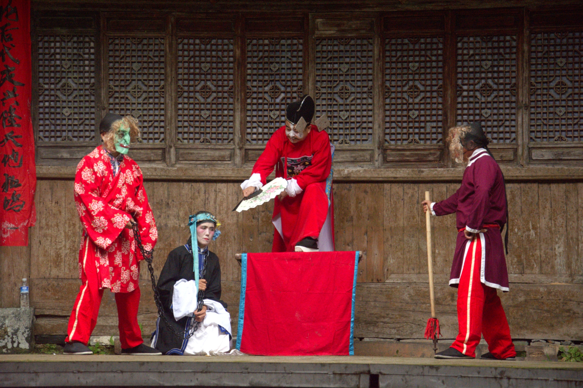 7月6日,實踐團隊成員在馬山目連戲劇團團長葉漢初的帶領下,前往馬山村敘倫堂欣賞目連戲現場表演,觀看了《跑五猖》和《三殿》。五猖分由五人扮演,穿紅衣,持鋼叉,臉上分畫青、紅、白、黑、黃五色,代表東、西、南、北、中五方,也寓意金、木、水、火、土五行。“跑五猖”能保一方平安,免受山中猛獸侵害。《三殿》主要說劉氏唱出為母十月懷胎三大苦難成功感化宋帝王而免遭刑罰。以鼓擊節,鑼鈸伴奏,不用管弦,只聲吟唱。