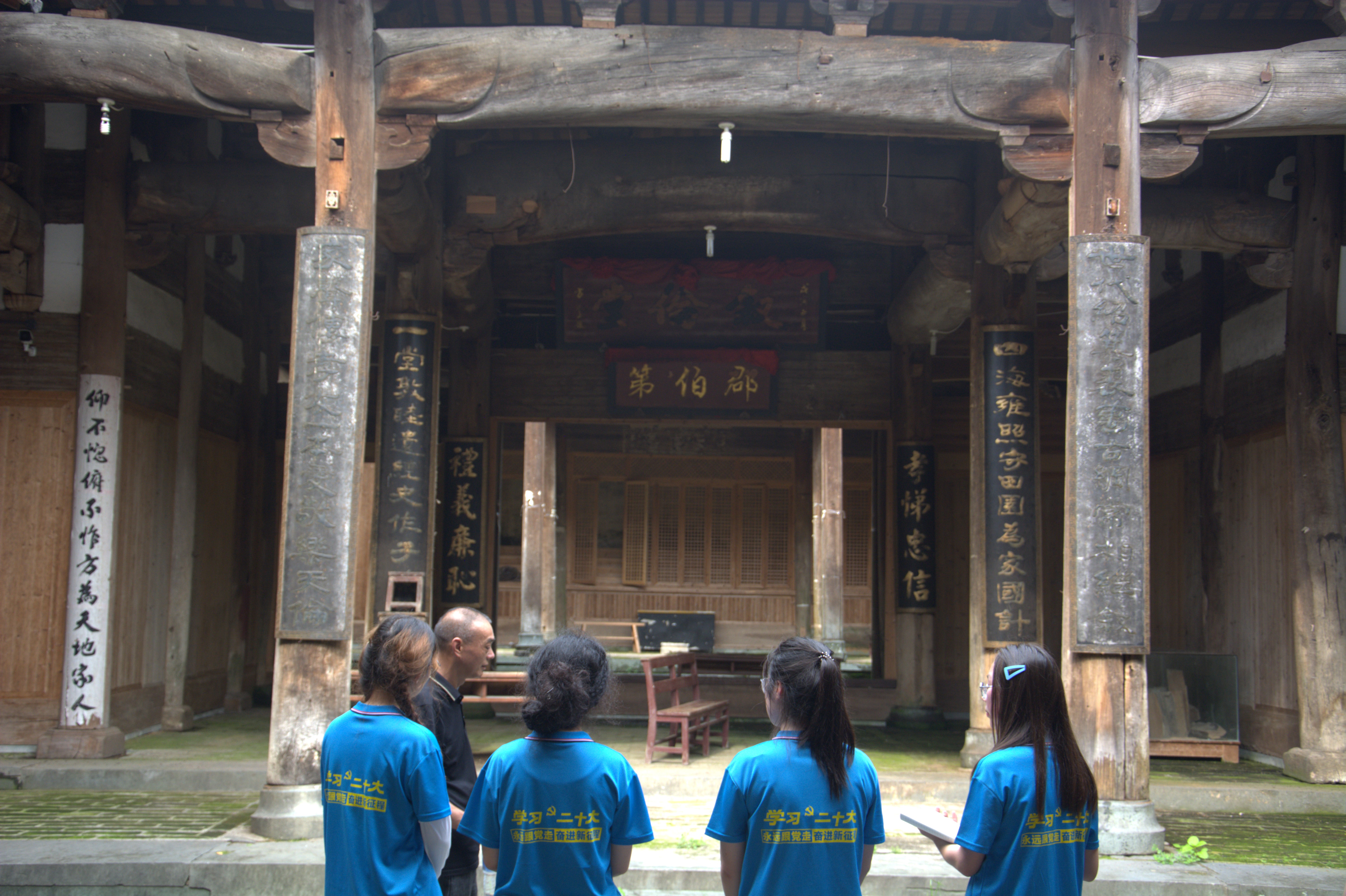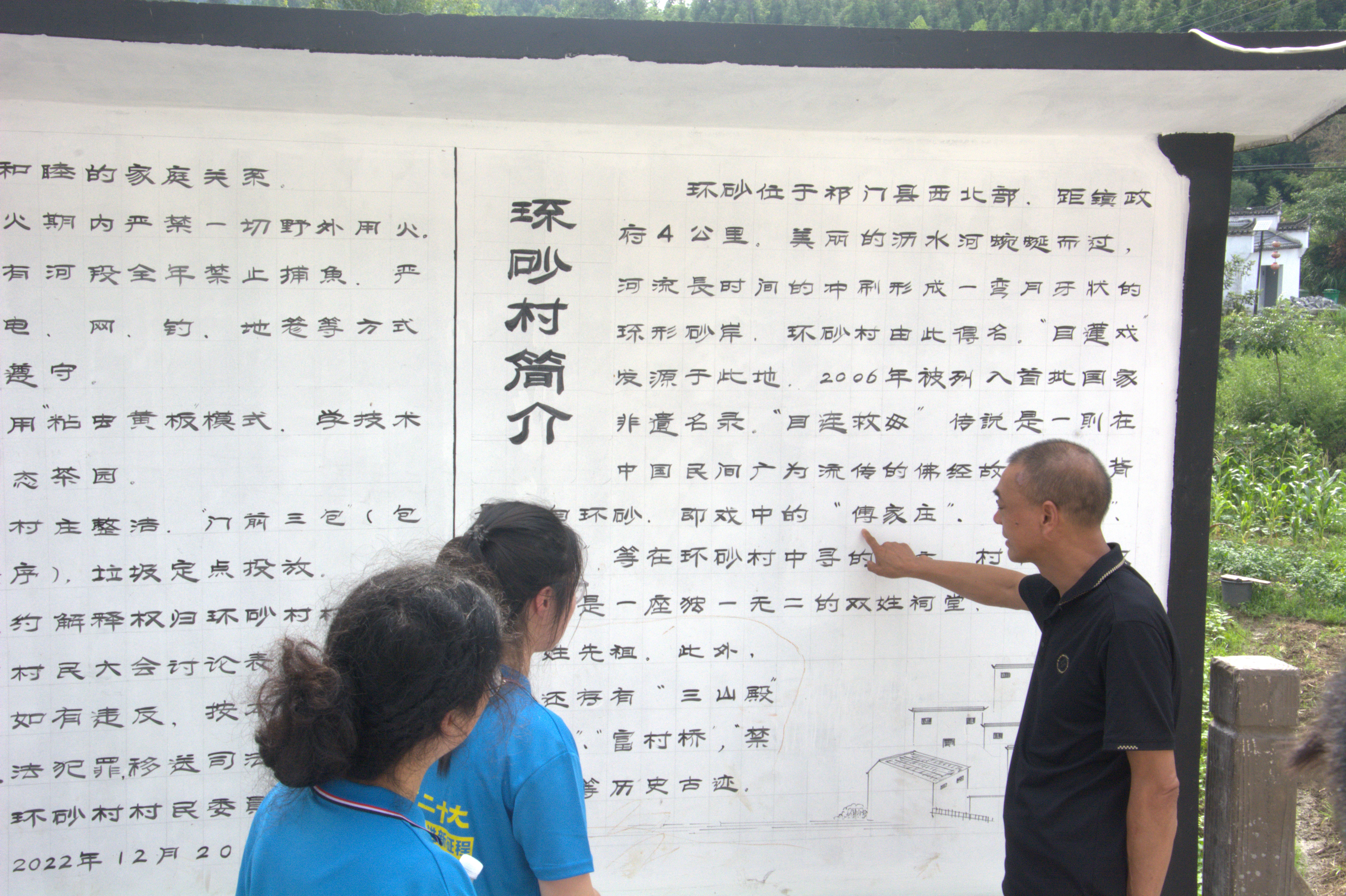 實踐團隨著方錦祁的腳步先后參觀了敘倫堂、富村橋、八卦井等歷史古跡。其中村中心的敘倫堂原是程、傅雙姓祠堂,現為環砂村目連戲傳習基地,已被列入省級文物保護單位。祠堂上用蒼勁有力的筆法寫著莊重大字“敘倫堂”和程氏祖訓“孝悌忠信、禮義廉恥”。目前,環砂村計劃將徽州磚雕與目連戲文化相結合,打造一座獨具魅力的非遺文化橋,以亮點村的形式來促進非遺傳承和鄉村振興。
