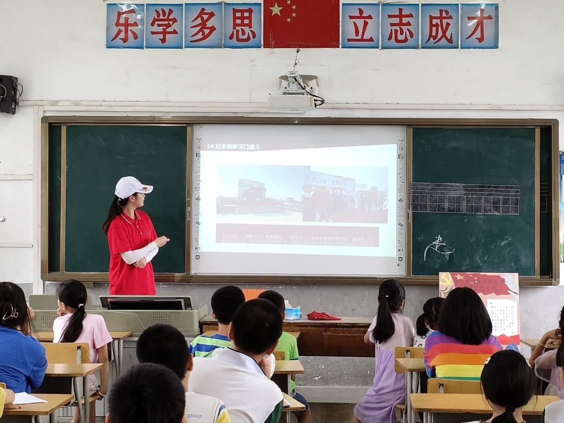 團隊隊長21級環境設計專業吳謝瑾同學以“蔣家河口伏擊戰——新四軍抗日第一仗”為題,結合實踐考察圖片、視頻、史料記載和人物調研等,生動形象又真實客觀地向小學生們展現蔣家河口伏擊戰的背景、過程、路線及意義。吳謝瑾同學以如何紀念蔣家河口戰斗結束宣講,強調要深入認識黨的精神譜系、傳承黨的紅色基因、賡續黨的紅色血脈。