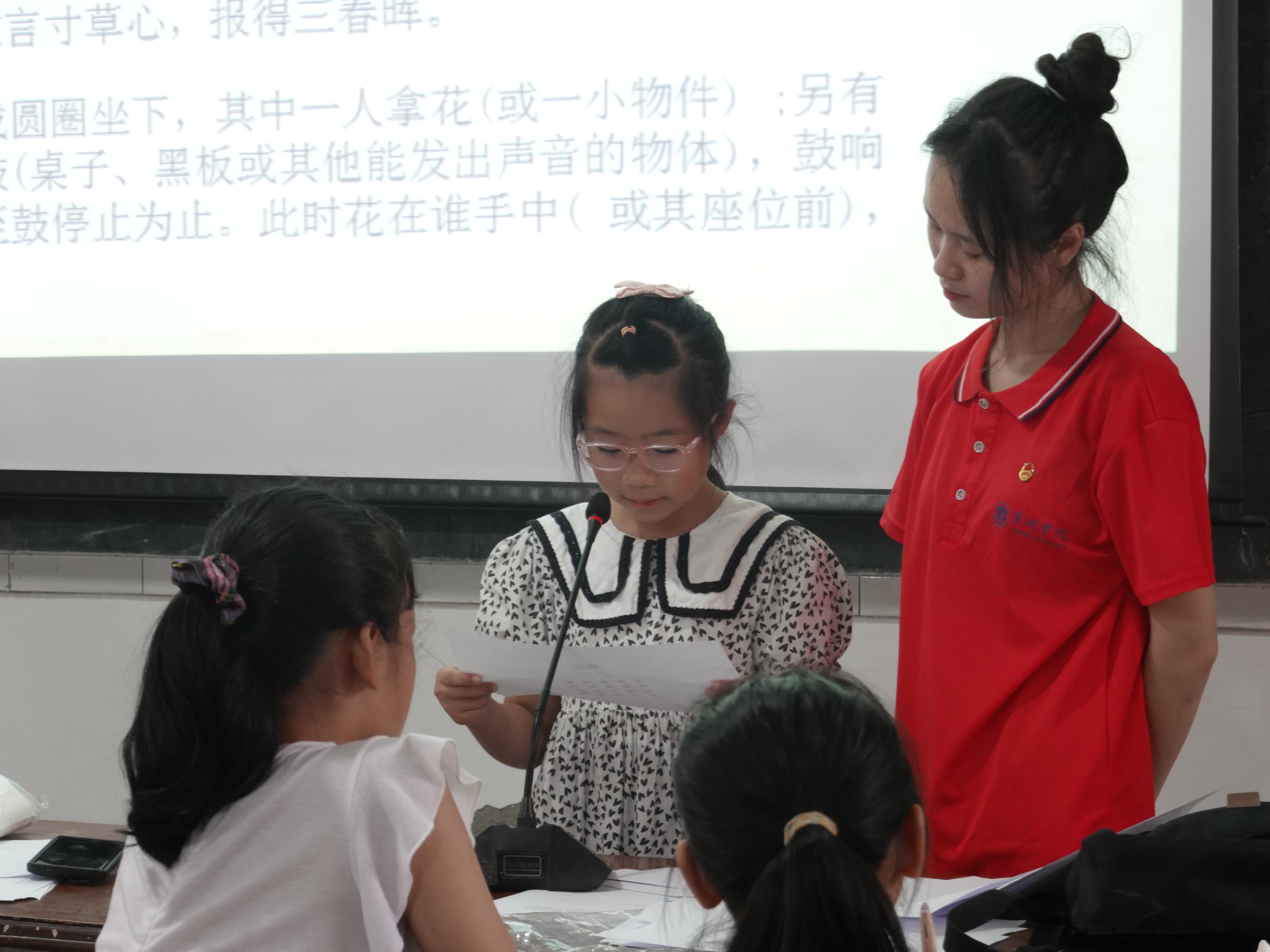 7月15日,實踐團隊成員在當地村委會的幫助下,在黃麓鎮開設趣味課堂,和當地小朋友積極互動。課堂上,團隊成員精心準備了《跟我念字正腔圓》、擊鼓傳花誦古詩、趣味繞口令和加部首成新字等活動,在寓教于樂中引導小朋友感受普通話和規范字的魅力。